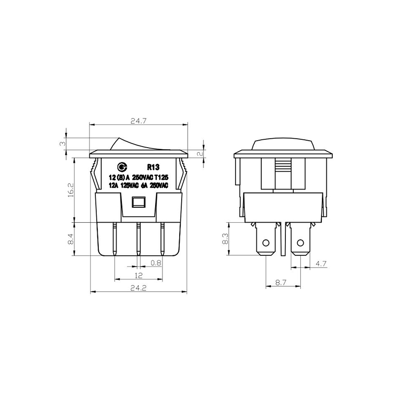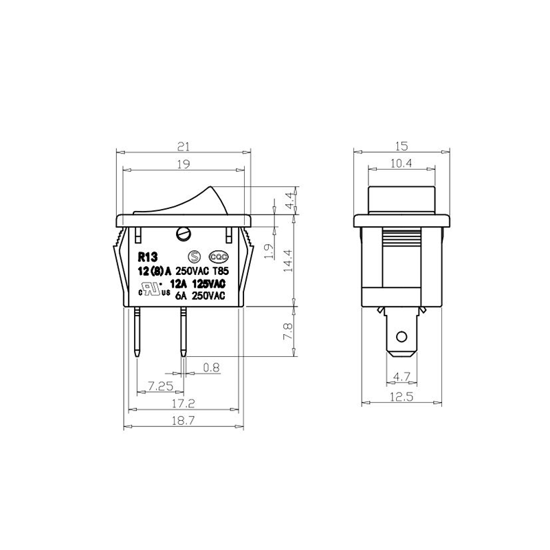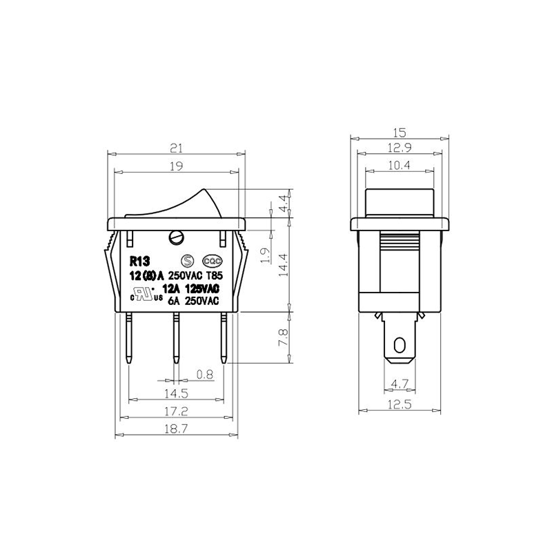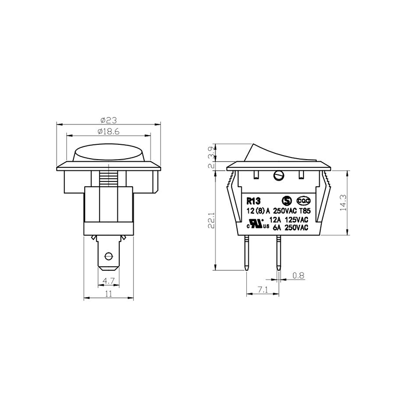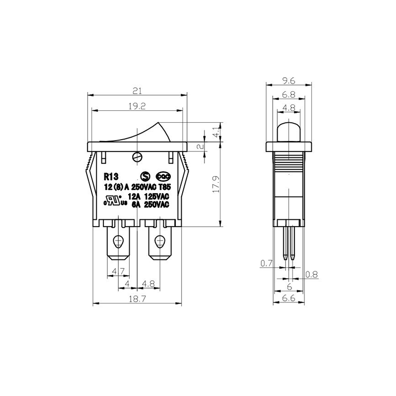 När det gäller funktionalitet ger R13-13-serien både 2-stifts och 3-stifts terminallayouter, som stöder SPST (Single Pole Single Throw) och SPDT (Single Pole Double Throw) kretskonfigurationer för att tillgodose olika elektriska designkrav. De tydliga "0/1"-markeringarna på ställdonet gör det enkelt att använda, medan färgalternativ i svart och vitt möjliggör visuell överensstämmelse med den slutliga produktdesignen.